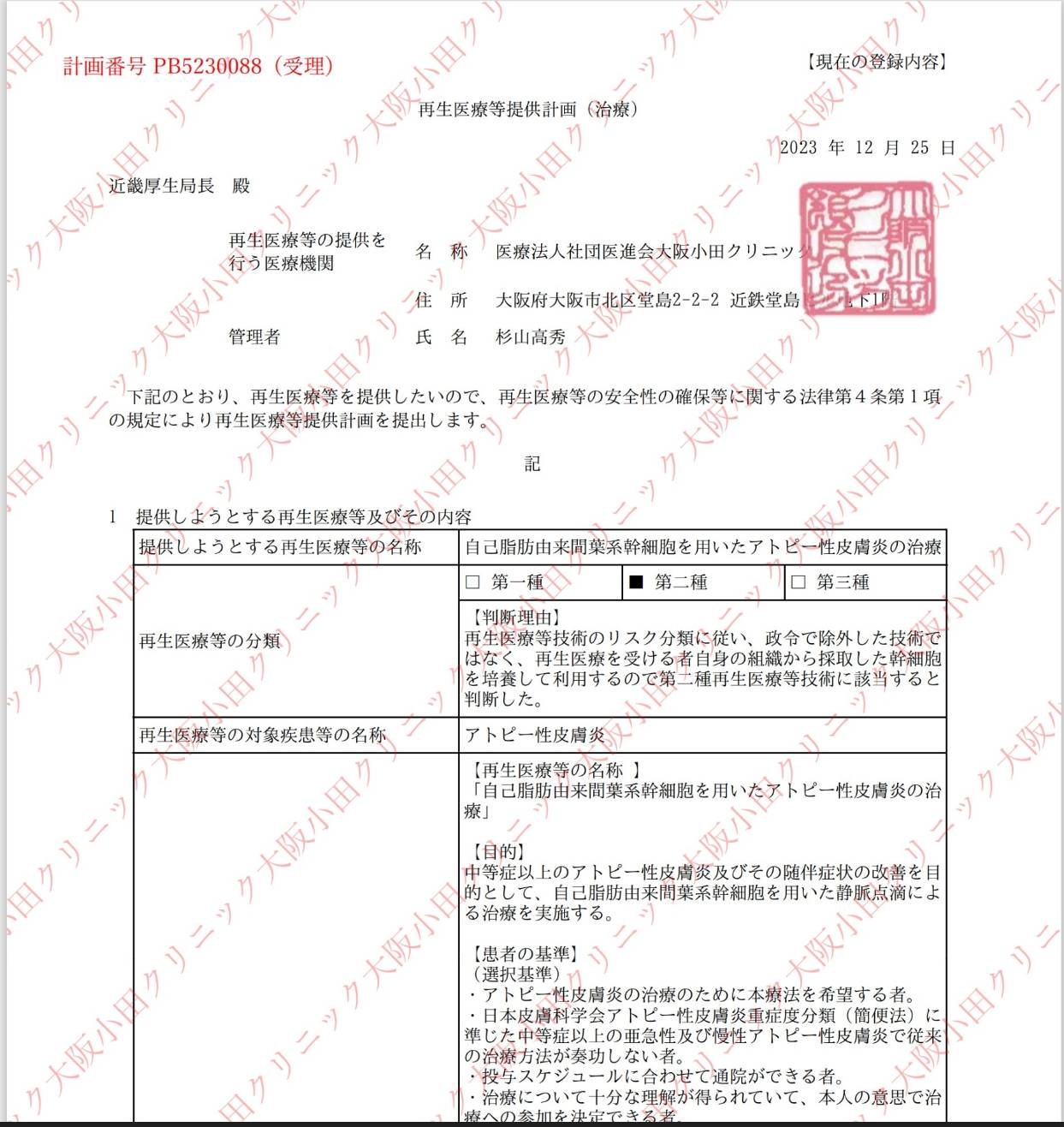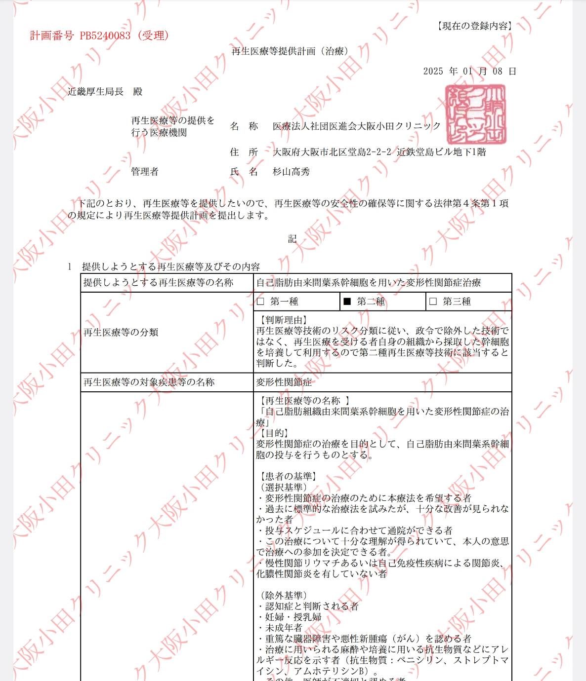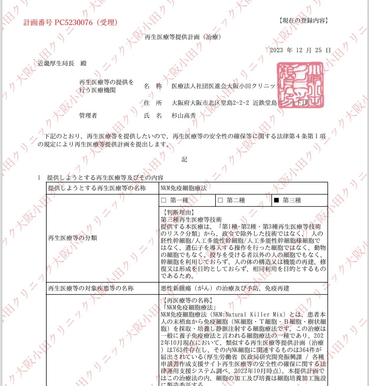 该医疗机构经过厚生劳动省认定的特定认证再生医疗委员会对其治疗的适当性,安全性,医疗系统,细胞处理管理系统等进行了严格的审查,并获得了规划编号.